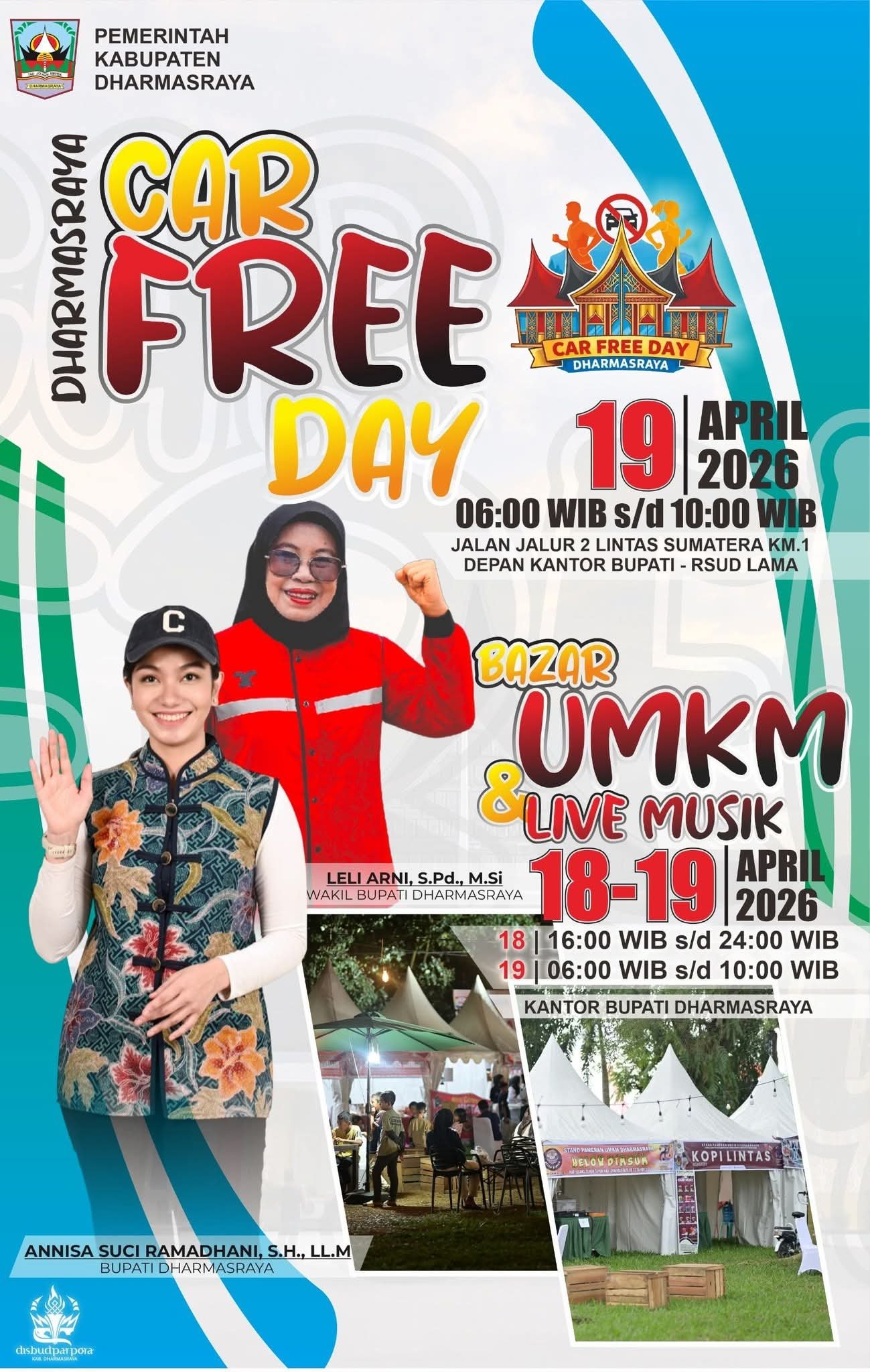 Selanjutnya, pada Minggu pagi (19/4), kegiatan Car Free Day akan digelar mulai pukul 06.00 WIB hingga 10.00 WIB. Pada waktu tersebut, kawasan sekitar lokasi acara yakni jalan lintas Sumatera jalur dua depan kantor Bupati sampai RSUD lama akan dibebaskan dari kendaraan bermotor, sehingga masyarakat dapat beraktivitas dengan lebih nyaman dan aman. Berbagai kegiatan seperti jalan santai, jogging, hingga bersepeda dapat dilakukan sambil menikmati suasana pagi yang lebih bersih dan segar.
