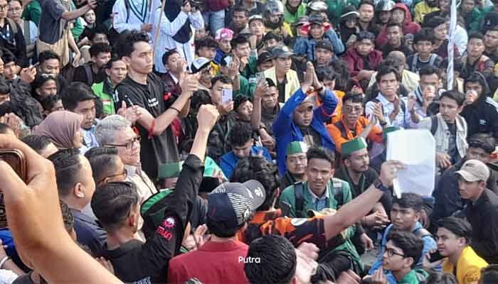Sekitar satu jam setelah aksi dimulai, Ketua DPRD Sumbar Muhidi bersama para wakil ketua, yakni Eviyandri, Nanda Satria, dan Iqra Chisa, didampingi Wakil Gubernur Vasco serta Kapolda Sumbar, menemui langsung para peserta aksi.