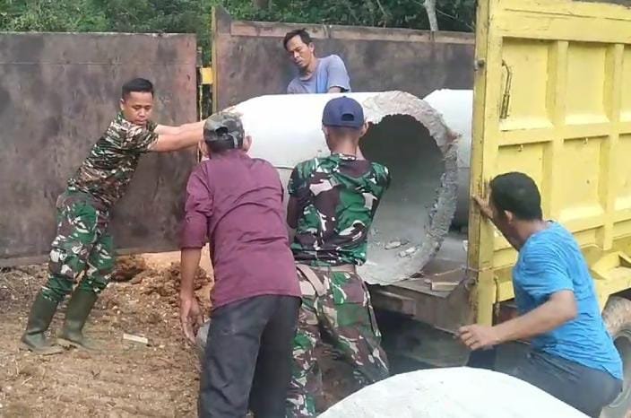 Serda Emil anggota satgas TMMD ke 122 Kodim 0420 Sarko dibantu anggota lainnya serta warga setempat menurunkan empat buah gorong-gorong.