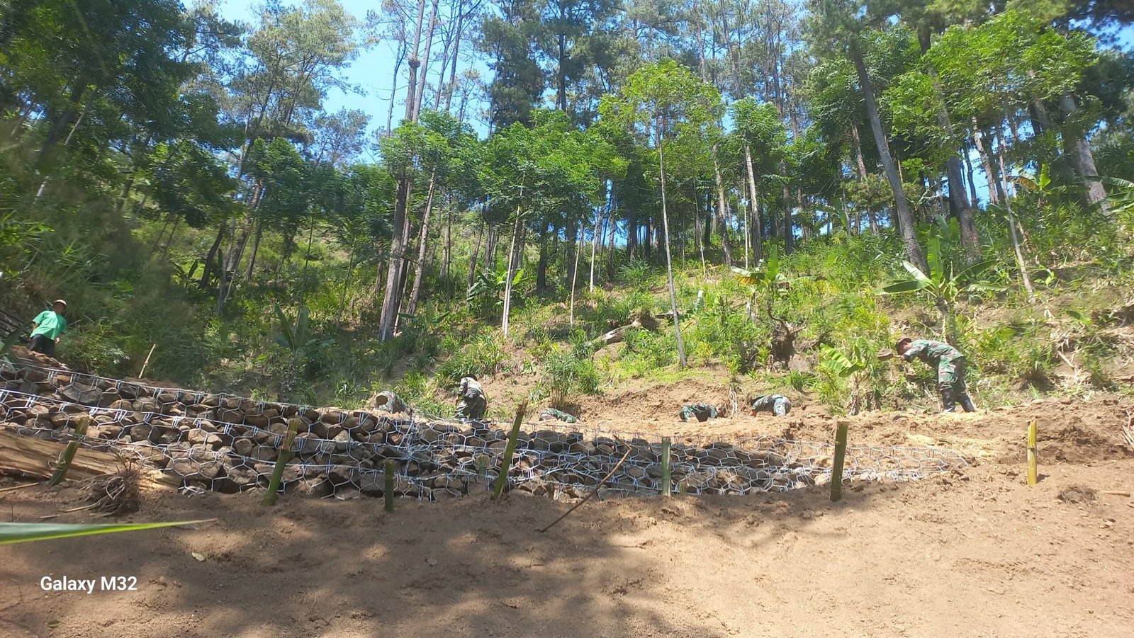 Salah satu sasaran fisik TMMD tersebut adalah pemasangan bronjong kawat sepanjang 20 meter dengan ketinggian 2,5 meter untuk mengantisipasi jalan longsor.