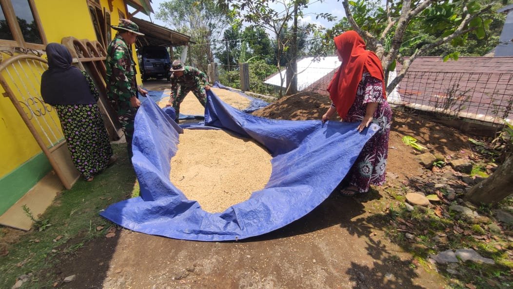 Tampak Sertu Fahruroyi dan Pratu ? Shodri di sela tugas dan tanggung jawabnya pengerjaan sasaran fisik di lokasi TMMD secara spontan membantu menjemur padi milik ibu Siti dengan menggunakan alas terpal biru.