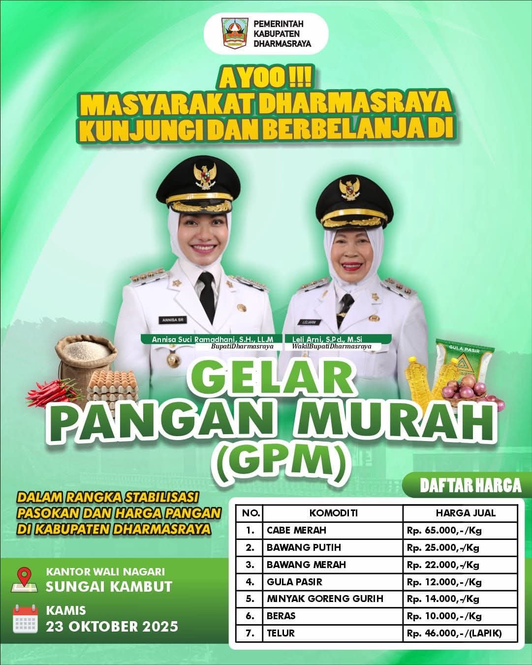 Pemerintah Kabupaten Dharmasraya melalui Dinas Pangan dan Perikanan kembali menggelar kegiatan Gelar Pangan Murah (GPM) sebagai upaya menstabilkan pasokan dan harga pangan di daerah. Kegiatan ini dilaksanakan di Kantor Wali Nagari Sungai Kambut, pada Kamis 23 Oktober 2025.