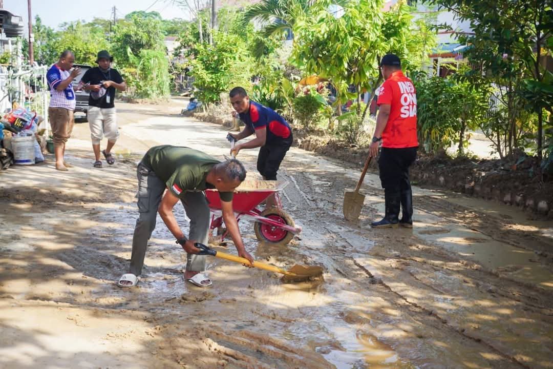 Dari arah perempatan jalur dua perumahan itu, rombongan berlogo Dharmasraya mulai terlihat. Sebanyak 50 relawan tiba dengan perlengkapan lengkap: sekop, selang, cangkul, gerobak dorong dan logistik lapangan. Mereka datang bukan hanya untuk menolong, tetapi untuk menetap dan bekerja selama lima hari penuh dalam proses pemulihan.