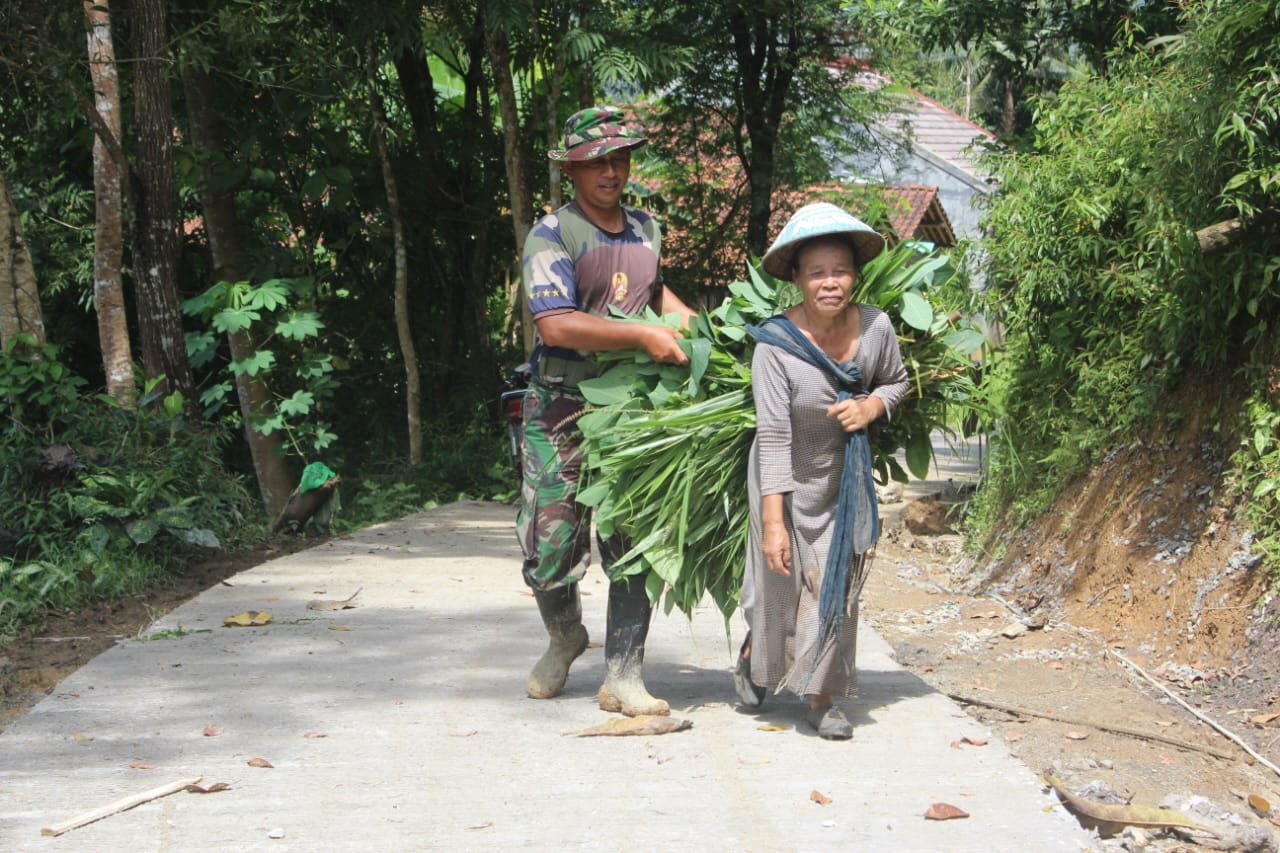 Seorang ibu melintas dengan ikatan daun pakan ternak di punggungnya. Langkahnya menyusuri sisi jalan yang masih dalam pengerjaan. Melihat itu, seorang prajurit menghentikan sejenak pekerjaannya. Dengan sigap ia membantu merapikan bawaan sang ibu, sembari mengingatkan agar berhati-hati melewati jalur yang masih licin oleh adukan semen. Senyum mereka bertaut, sederhana namun tulus.