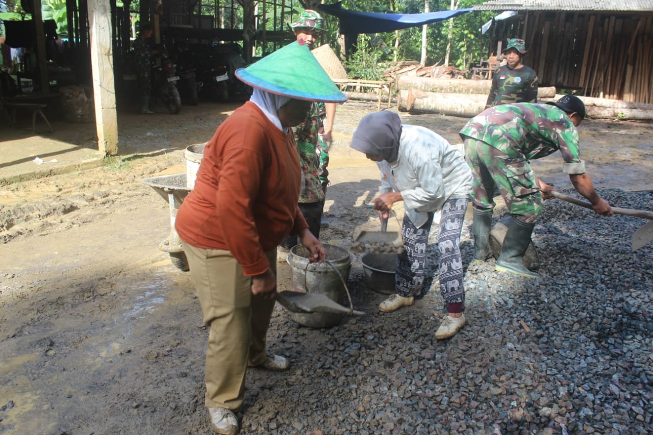 Di lokasi pengecoran, loreng TNI dan kain daster ibu-ibu berpadu dalam satu irama kerja. Mereka saling menyemangati, saling menguatkan. Rabat beton yang dicor hari itu bukan hanya menghubungkan satu titik ke titik lain, tetapi juga menyatukan hati dalam satu tujuan: kemajuan desa.