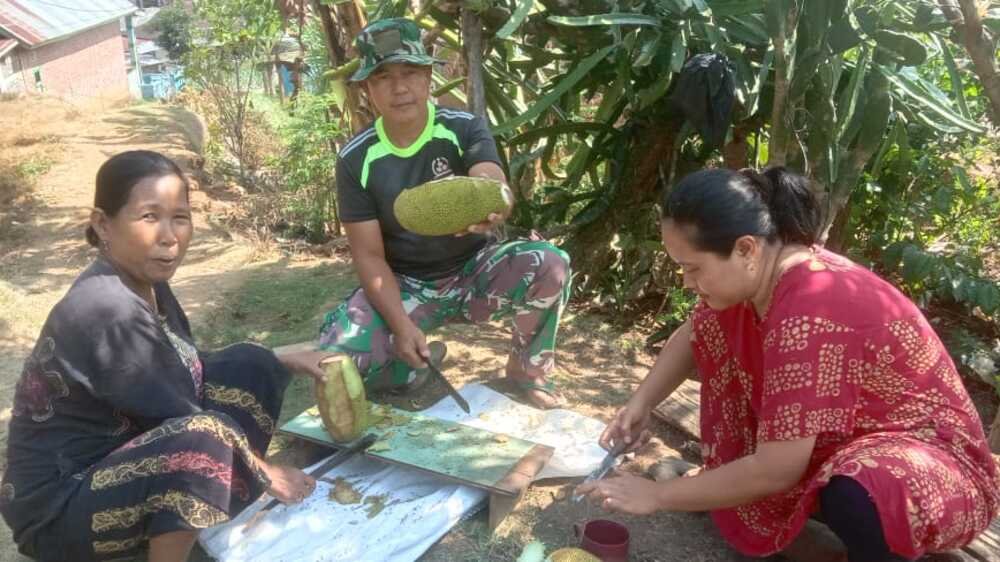Pelda Ferry Iskandar ikut membantu ibu-ibu mengupas buah nangka, yang akan di masak serta disantap bersama-sama.
