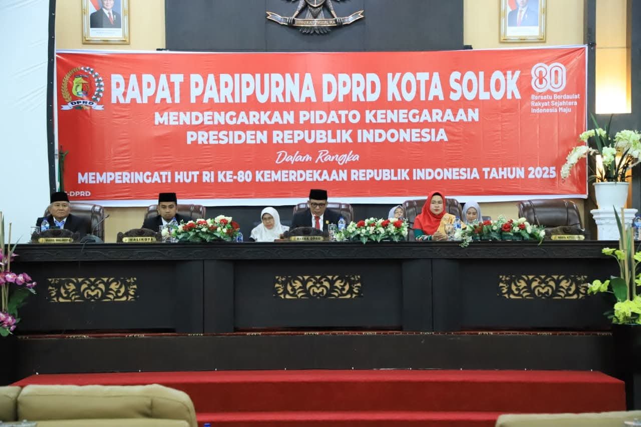 Solok, (Utamapost) – DPRD Kota Solok menggelar rapat paripurna mendengarkan Pidato Kenegaraan Presiden Republik Indonesia dalam rangka HUT RI Ke – 80 Tahun 2025 pada Kamis (15/08/2025), bertempat diruangan Rapat Paripurna DPRD Kota Solok.