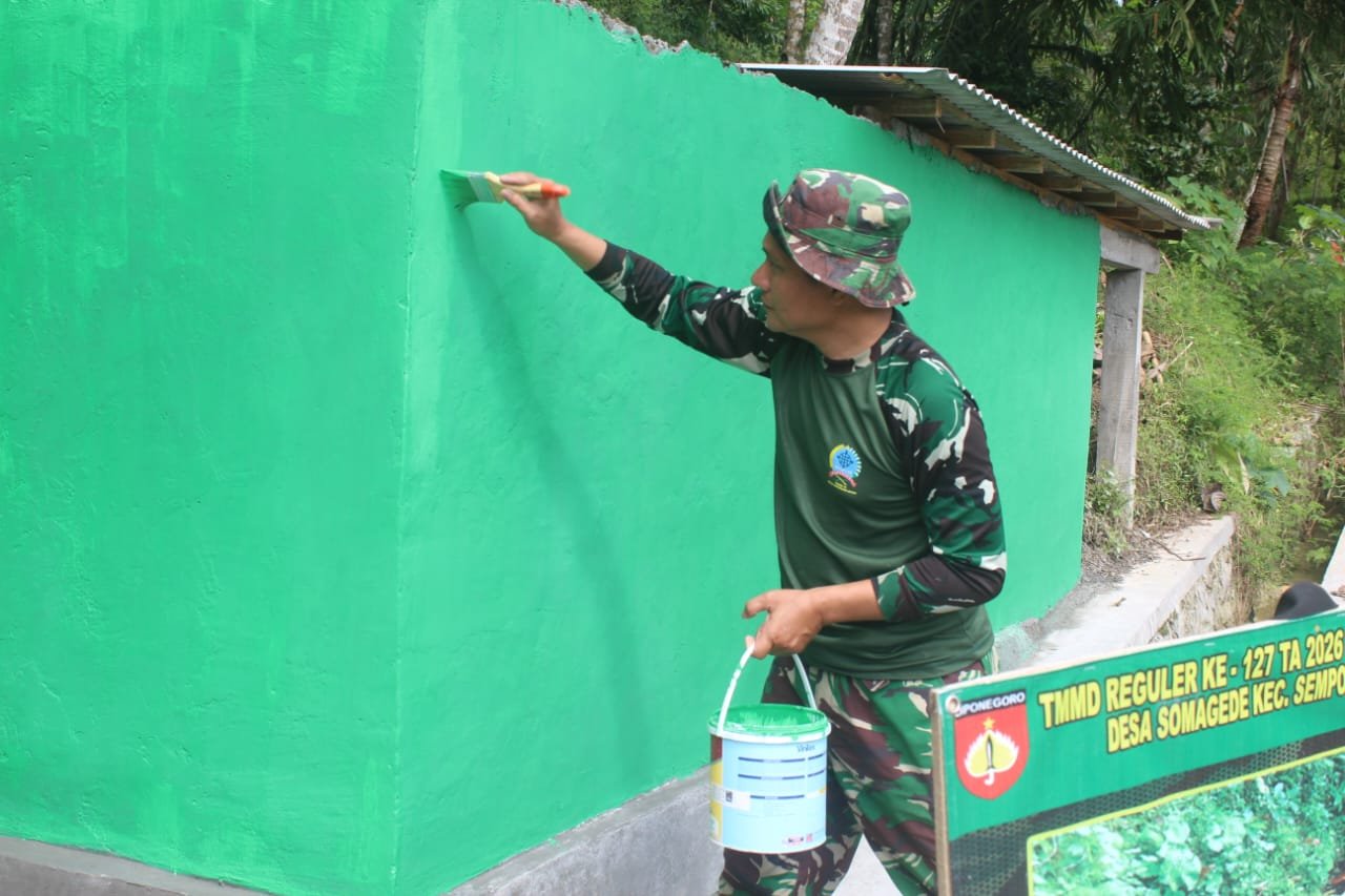 Kebumen – Kamis (05/03/2026), Satgas TMMD Reguler ke-127 Kodim 0709/Kebumen melaksanakan tahap finishing pengecatan dinding bangunan pipanisasi di Desa Somagede. Kegiatan ini menjadi bagian akhir dari pembangunan sarana air bersih yang akan dimanfaatkan warga setempat.