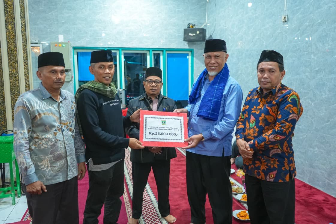 Dalam kesempatan itu, Gubernur Mahyeldi menyerahkan bantuan hibah sebesar Rp25 juta untuk mendukung rehabilitasi masjid, serta 20 mushaf Al-Qur’an wakaf dari ASN Pemerintah Provinsi Sumbar.