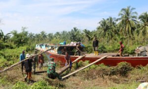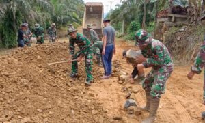 Muba (UtamaPost)– Personel Kodim 0401/Muba yang juga anggota Satgas TNI Manunggal Membangun Desa (TMMD) ke-119 bergotong royong bersama warga menurunkan bahan untuk...