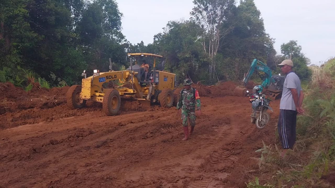 Terlihat dilokasi pekerjaan para anggota satgas terus ikut mengawasi dan mengawal jalannya pengerjaan pembukaan badan jalan.