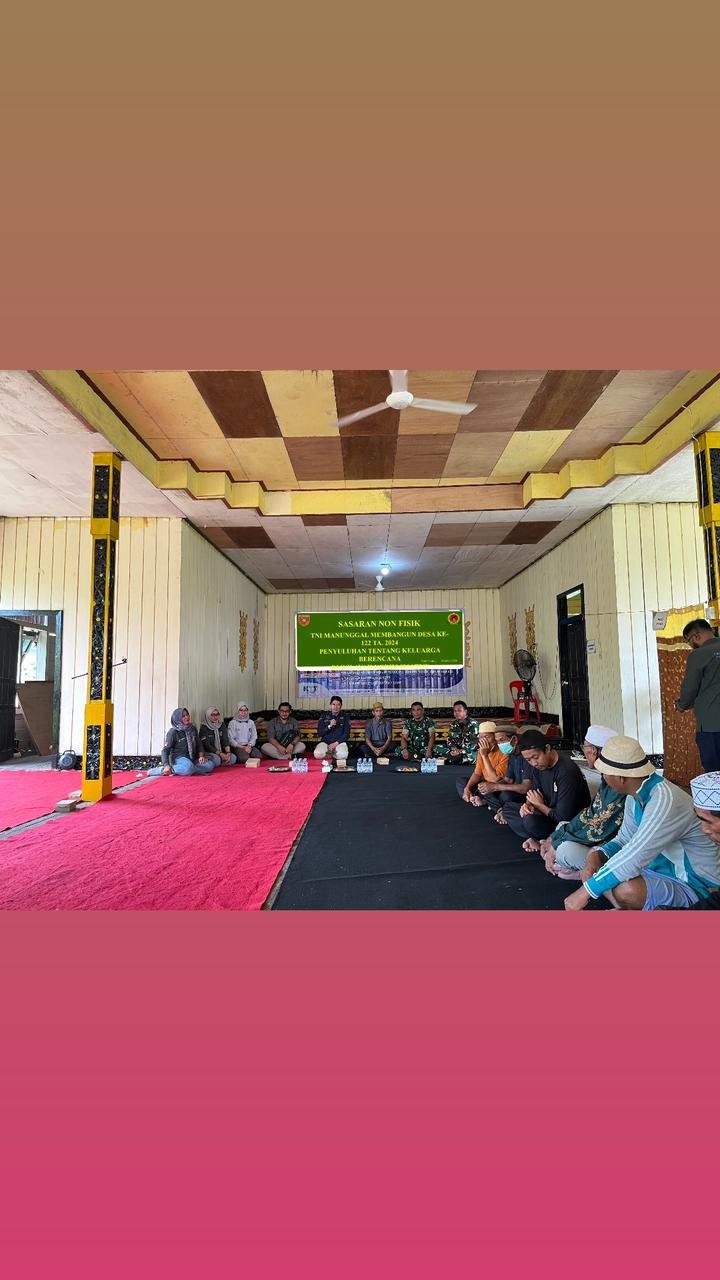 Tana Tidung – Program Tentara Manunggal Membangun Desa (TMMD) ke-122 Kodim 0914/TNT memberikan penyuluhan Keluarga Berencana kepada masyarakat. Penyuluhan Keluarga Sehat dan Keluarga Berencana oleh Dinas Pengendalian Penduduk dan KB berlangsung di Balai Desa Menjelutung. Minggu (20-10-2024)