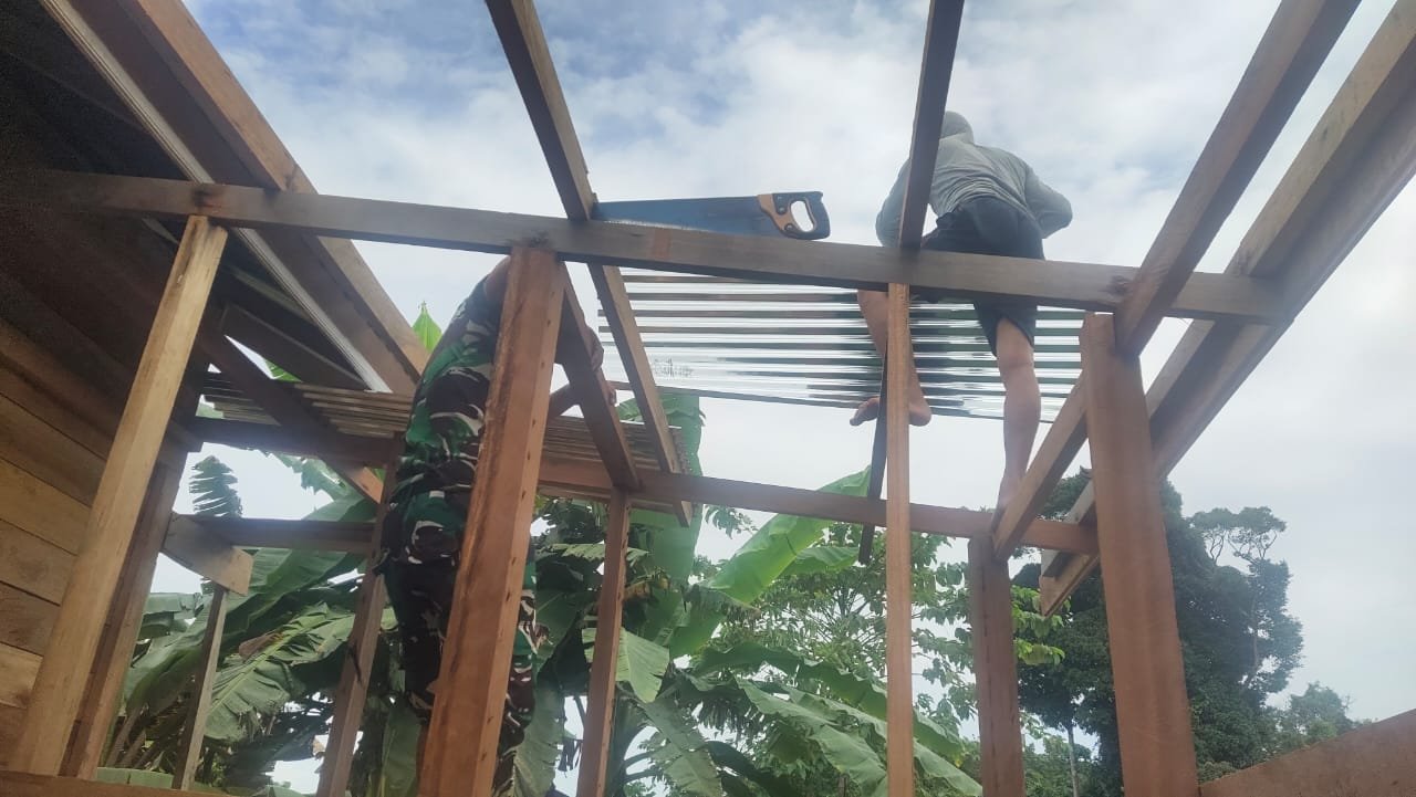 Saat ini capaian pengerjaan RTLH milik Bapak Gatot sudah mencapai 79 persen pengerjaan, Satgas TMMD Kodim 0914/TNT melaksanakan pemasagan atap dapur dan terus berupaya dengan semaksimal mungkin selesai dengan jangka waktu yang telah di tentukan sebelumnya,