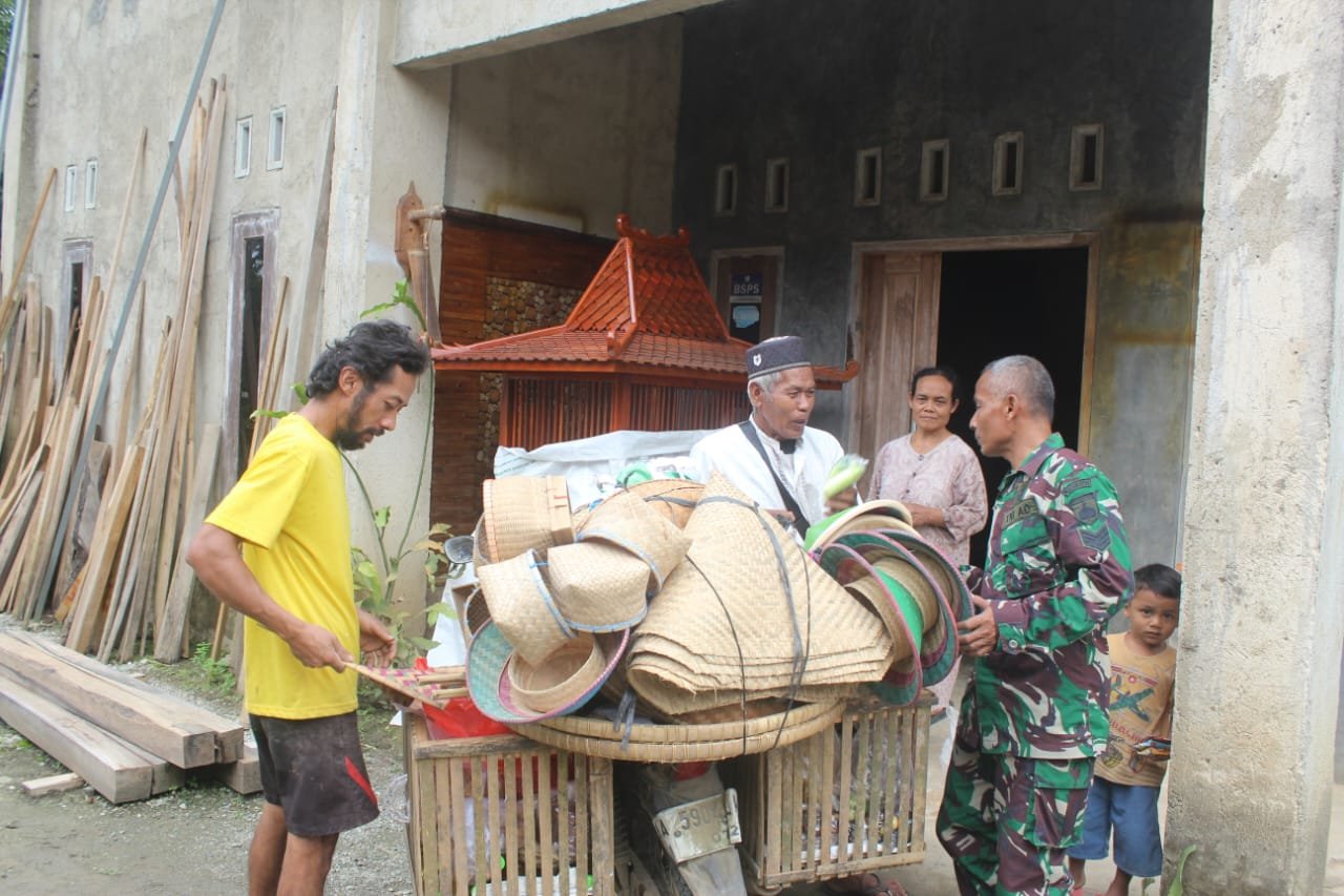 Penjual tersebut membawa berbagai hasil kerajinan seperti caping dan perlengkapan lainnya yang terbuat dari bambu. Dengan ramah, Serma Suparman menghentikan sejenak aktivitasnya untuk berbincang santai, menanyakan dagangan sekaligus memberi semangat kepada pedagang yang tengah mencari rezeki.