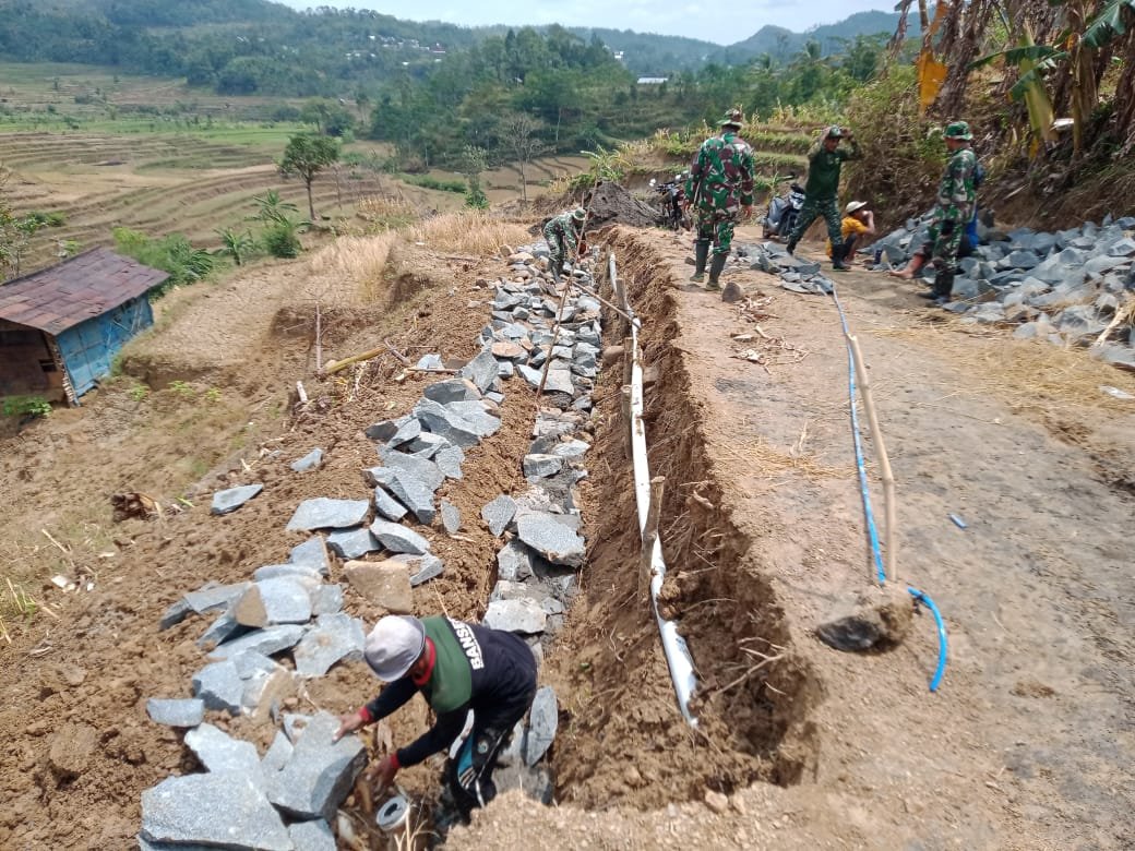 Tampak terlihat segenap anggota Satgas bersama warga langsung berjibaku peralatan yang ada, guna mengerjakan salah satu sasaran fisik yakni pembuatan talud.