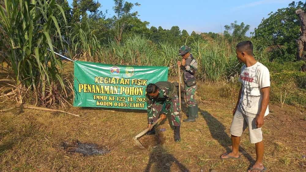 EMPAT LAWANG – Sasaran fisik penanaman bibit pohon dan buahan kini progressnya telah mencapai 85 persen, yang mana personil Satgas TMMD ke-122 Kodim Lahat kini menanam pohon Bambang lanang.