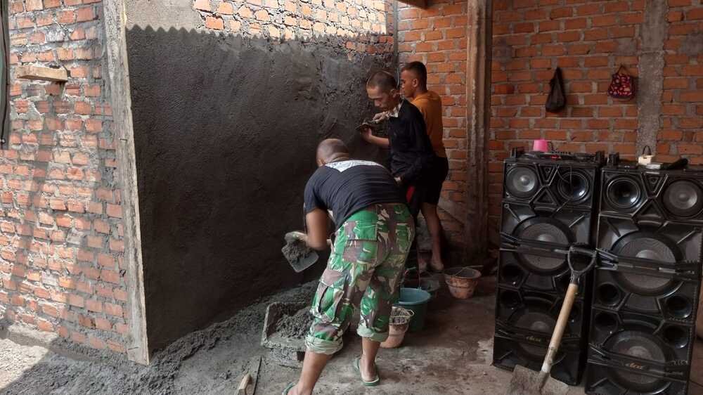 EMPAT LAWANG, – Satgas TMMD ke-122 Kodim Lahat dalam melaksanakan tugas di sasaran fisik poskamling diiringi lantunan musik.