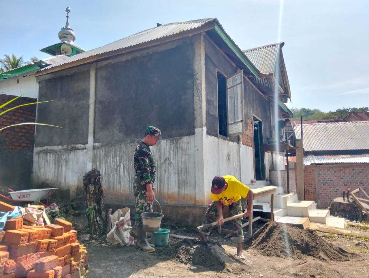 EMPAT LAWANG – Setelah pekerjaan memplester dinding dalam Mushola Syiar Islam, Desa Lampar Baru, Kecamatan Talang Padang, Kabupaten Empat Lawang, kini Anggota TMMD ke 122 Kodim 0405/Lahat beralih kepada bagian luar.