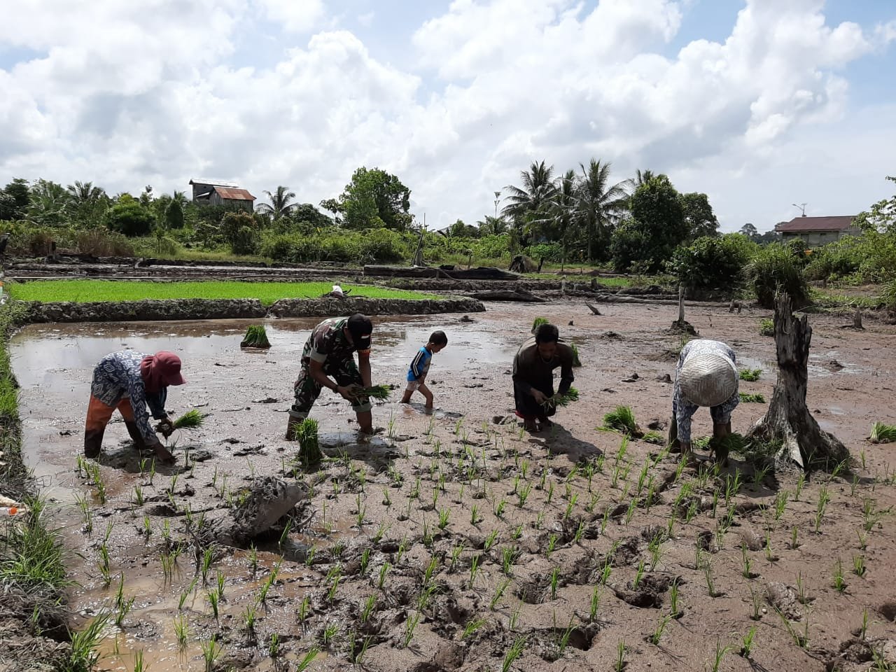 Di sektor pangan ini, anggota Satgas TMMD, Satgas TMMD 122 Sertu P. Sinaga berbaur bersama warga laksanakan penanaman padi, Rabu (9/10/2024).