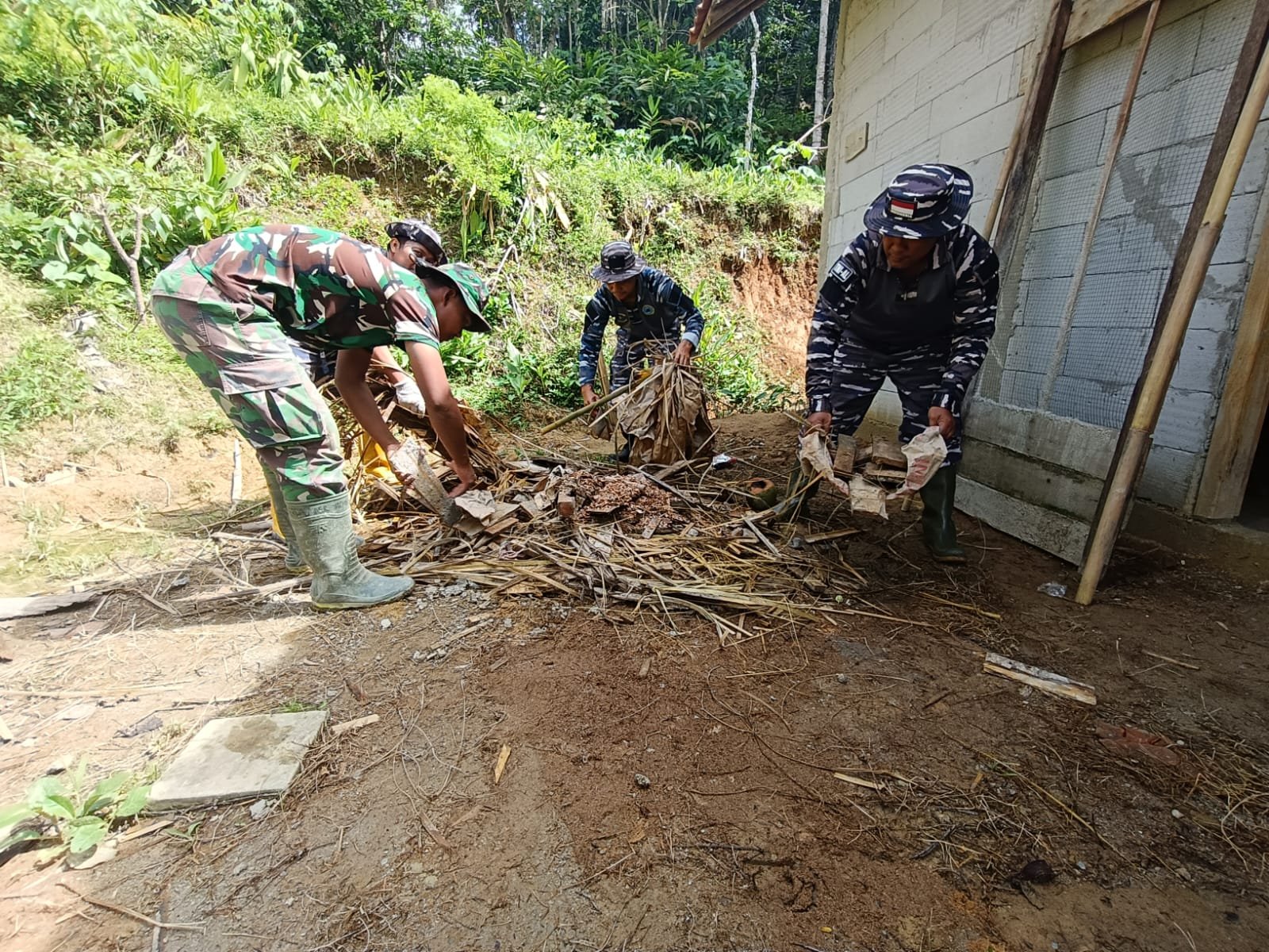Setelah proses pembangunan hampir rampung, para prajurit bersama warga bergotong royong mengumpulkan potongan kayu dan material yang tersisa agar lingkungan rumah kembali bersih dan rapi. Dengan peralatan sederhana, mereka menata sisa material agar tidak mengganggu aktivitas penghuni rumah.