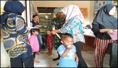 Pelayanan kesehatan kepada masyarakat Warga Tanah lia berupa Posyandu yang kita lakukan bersama personel Satgas TMMD ke-122 ini di antaranya penimbangan balita, pemeriksaan ibu hamil dan pemberian gizi.