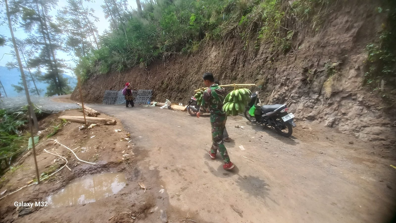 Saat beristirahat siang anggota satgas TMMD ke 122 bersama warga lebih memilih istirahat dilokasi pekerjaan, saat sedang istirahat anggota Satgas TMMD Pratu Hilkia melihat seorang warga yang sedang bersusah payah memanggul buah pisang hasil panen dari kebun miliknya untuk dibawa pulang ke rumah.Minggu (20/10/2024).
