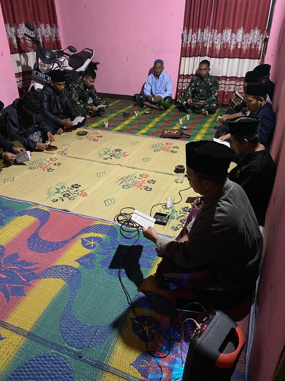 Pemalang (UtamaPost) – Anggota Satgas TMMD Reguler 122 tahun 2024 Kodim 0711/Pemalang selalu terlibat dalam kegiatan kemasyarakatan di desa Tambi, salah satunya kegiatan Yasinan yang dilaksanakan setiap malam Jumat. Kali ini kegiatan Yasinan bertempat di rumah bapak Kirom RT 15/02 desa Tambi kecamatan Watukumpul kabupaten Pemalang, Kamis malam (3/10/2024).