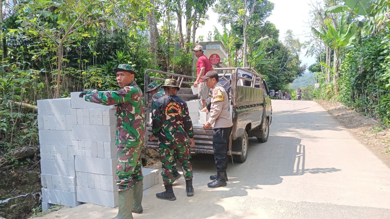 Tampak Satgas bersama warga begitu semangat mengangkat batu bata hebel ke rumah Ibu Maryatun, salah satu warga desa Tambi yang akan direhab melalui di TMMD Reguler ke 122 tahun 2024 Kodim 0711/Pemalang.