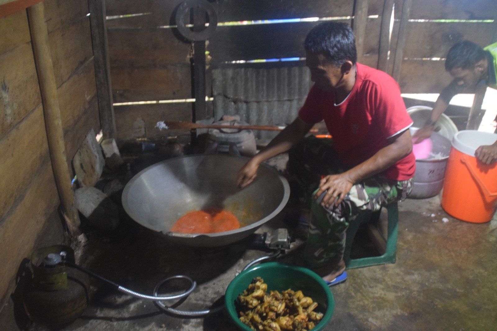 Saat ini ada 4 anggota Satgas TMMD ke 122 bertugas di dapur umum yakni Sertu Okta, Kopda Ricci, Praka Randa dan Praka Rahmad Ican. Mereka berempat bertugas menyiapkan makanan bagi anggota satgas TMMD mulai dari sarapan, makan siang hingga makan malam.
