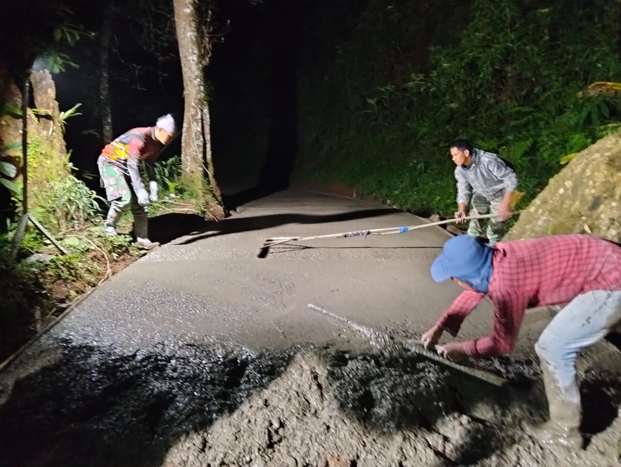 Cipelah, Kab. Bandung – Semangat gotong royong dan kerja keras tak mengenal waktu, anggota Satgas TMMD Reguler Ke-127 Kodim 0624/Kab. Bandung bersama masyarakat Desa Cipelah terus memacu pengecoran jalan hingga larut malam. Pada hari Kamis, 19 Februari 2026, pukul 23.00 WIB, kegiatan pengecoran jalan kembali dilaksanakan di Kampung Babakan Simpang Gunung Leutik Desa Cipelah Kecamatan Rancabali Kabupaten Bandung.