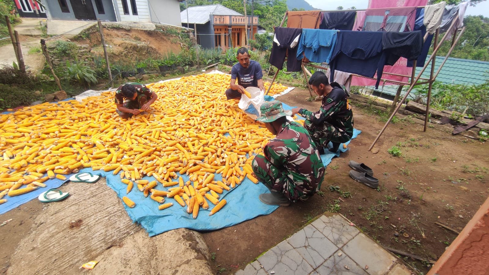 Terlihat ditengah kesibukan pekerjaan sasaran fisik dan non fisik Personel satgas TMMD ke 122 Pratu Hilkia dan rekan seperjuangannya membantu menjemur jagung milik bapak Kusnadi (57) warga Jambu wetan desa Tambi.