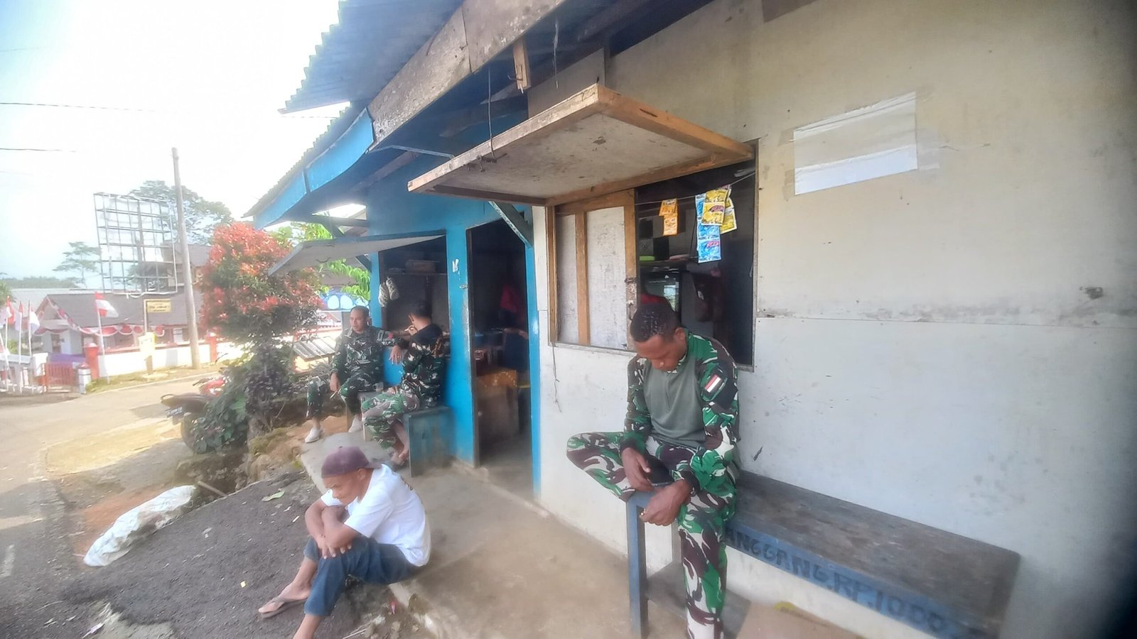 Menjadi rutinitas, beberapa anggota satgas TMMD ke 122 sebelum memulai pekerjaan di sasaran fisik, menyempatkan mampir di warung kopi milik bapak Kirom (57) RT 07/ RW 02 sambil menunggu rekan – rekanya, sekaligus melakukan komunikasi sosial dengan masyarakat setempat.